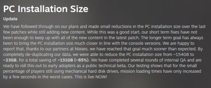 Ovaj rezultat ostvaren je zahvaljujući saradnji sa Nixxes-om, koji je pomogao u potpunoj deduplikaciji podataka, što ne samo da smanjuje veličinu instalacije, već i ubrzava učitavanja igre za svega nekoliko sekundi.