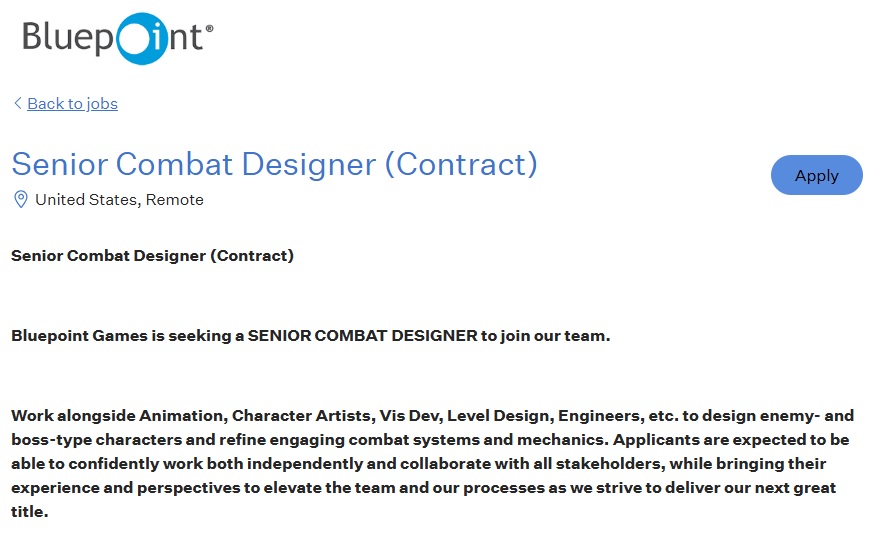 U novom oglasu za posao, Bluepoint traži Senior Combat Designera sa iskustvom u radu na igrama iz trećeg lica koje su fokusirane na melee combat. Naravno, ovaj projekat može biti doslovno bilo šta, ali neki veruju da je u pitanju Bloodborne rimejk. Bluepoint je poznat po modernizaciji starijih igara, a njihov poslednji projekat bio je rimejk Demon’s Soulsa.