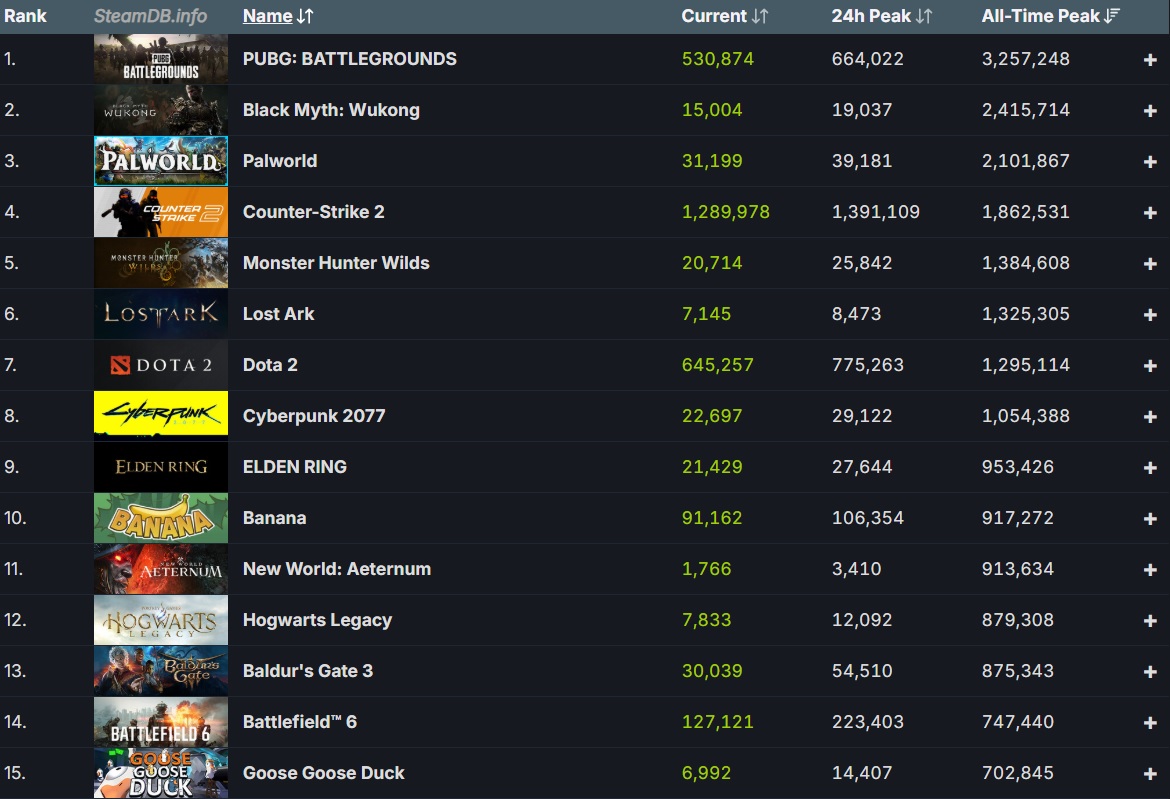 Kako se bližimo kraju godine, bio bi red da pogledamo koja igra iz 2025. je dostigla najveći broj istovremenih igrača. Na naše veliko iznenađenje, ova titula je pripala Capcom-ovom akcionom RPG-u, Monster Hunter Wilds, koji je, prema podacima sa SteamDB-a, dostigao 1.384.608 istovremenih igrača. Time je zauzeo i peto mesto na listi igara sa najvećim pikom, odmah iza: Counter-Strike 2 (1.862.531), Palworld (2.101.867), Black Myth: Wukong (2.415.714) i PUBG (3.257.248). Pored toga, Monster Hunter Wilds je i dalje najprodavanija igra 2025. godine.